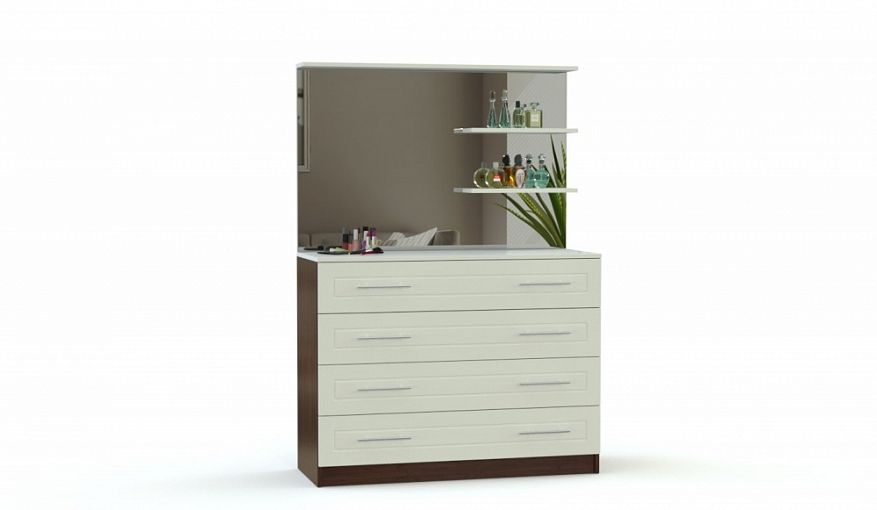 Комод Прага 01 BMS, дополненный зеркалом с боковыми полочками для мелочей, может использоваться как туалетный столик. Элегантная модель в современном классическом стиле с корпусом в темных древесных тонах и белым фасадом украшена рамочной фрезеровкой. Для удобного хранения уходовых средств, одежды и домашнего текстиля конструкцией предусмотрены четыре выдвижных ящика, оснащенных парными ручками-рейлингами. Купить комод Прага 01 BMS и рационально организовать пространство вам поможет наш интернет-магазин.
