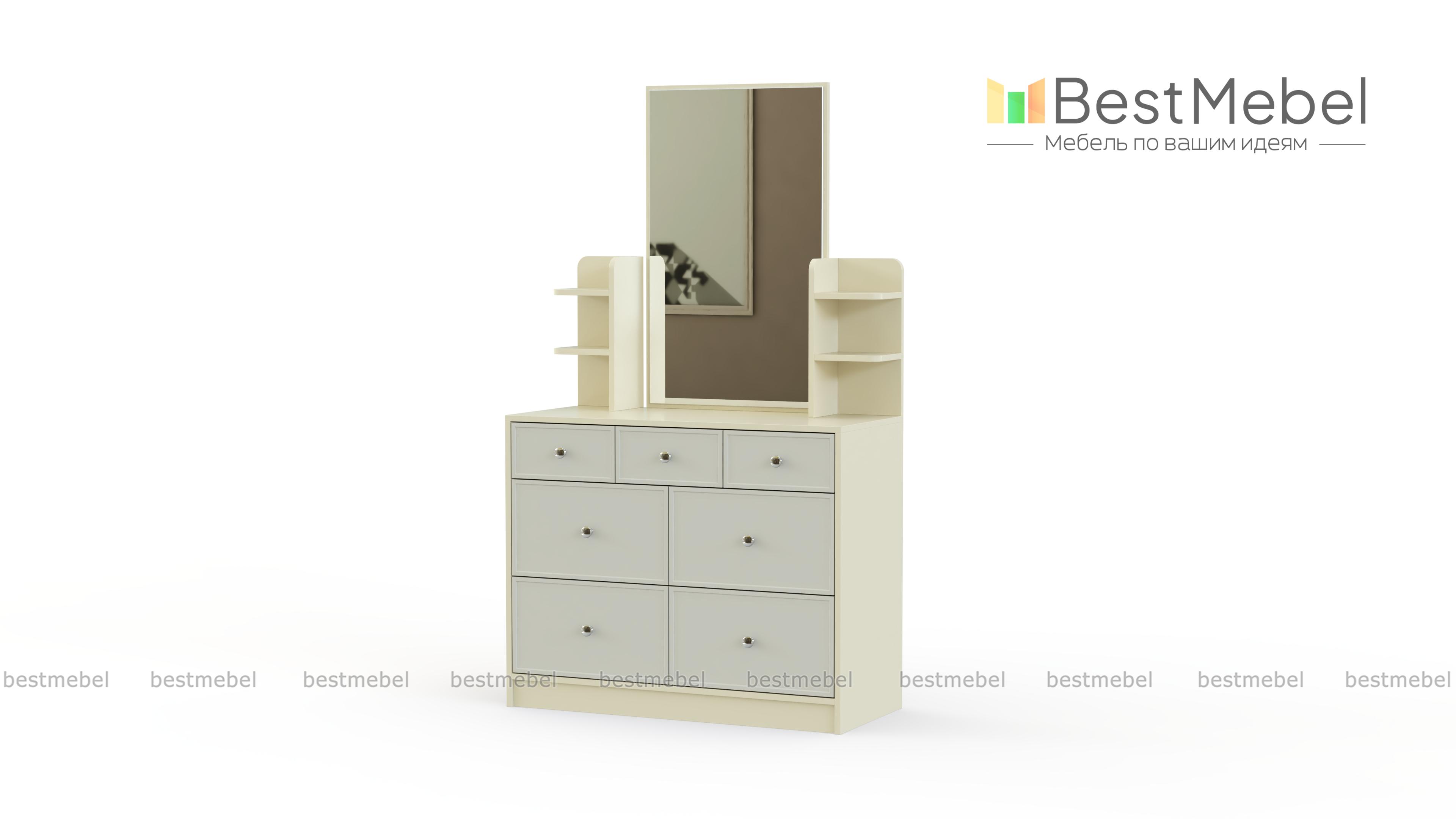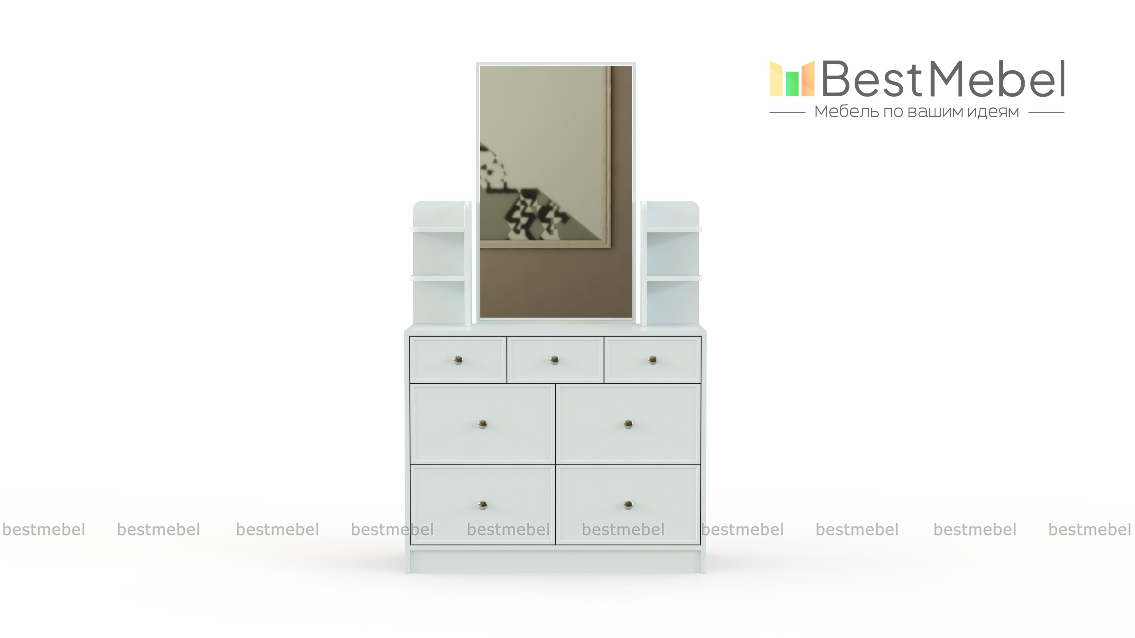 Комод с зеркалом Бридж-2 BMS станет прекрасным выбором для небольших спален, помогая сэкономить на лишней мебели. Модель выгодно отличается компактными размерами и выполнена в светлых белых тонах. Вместительный комод с шестью выдвижными ящиками разных размеров для белья, одежды и бытовых мелочей дополнен надстройкой с открытыми полочками под уходовые средства и навесным зеркалом. Купить комод с зеркалом Бридж-2 BMS приглашаем в наш интернет-магазин по доступной цене.