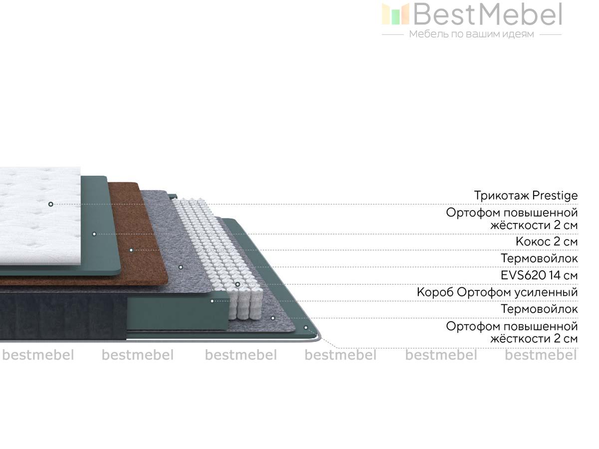 Состав: Меморикс 2см \ Ортофом (ППУ) 2см \ Ортофом (ППУ) высокоэластичный 5 см \ Спанбонд \ EVS620 16см \ Спанбонд \ Ортофом (ППУ) повышенной жесткости 2см \ Короб Ортофом (ППУ).