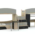 Оригинальная детская двухъярусная кровать ДМ-188 BMS, где интересно решено сочетание зон для отдыха и учебы, элементов под хранение. Здесь 3 спальных места (основание – ЛДСП), расположенных на разных уровнях (два наверху, одно внизу). В центре композиции лестница, где ступени оборудованы ящиками для вещей. Пара столов, разнесенных по разных сторонам, позволит детям заниматься, не мешая друг другу. Обе модели оснащены тумбами, где в ящиках ребенок сможет хранить свои тетради/учебники. В дизайне использовано много полукруглых элементов, что придает изделию необычный вид и дополнительную безопасность. Цветовая гамма подбирается по вкусу и особенностям интерьера комнаты.