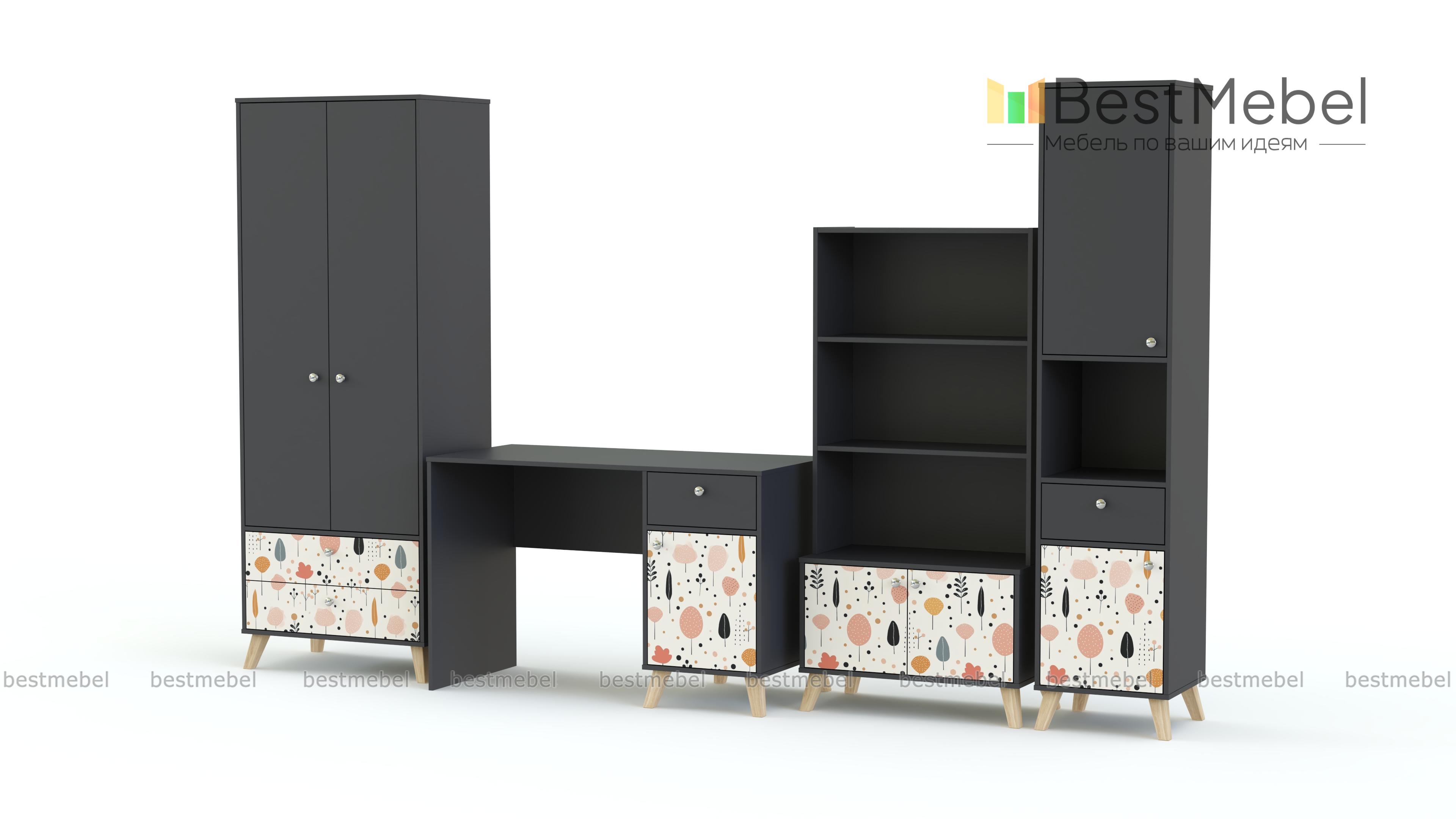 Детская комната Эльза 8 BMS включает в себя все необходимое для обустройства рабочей зоны и комфортной системы хранения. В комплекте письменный стол с тумбой, два комбинированных книжных стеллажа и шкаф для одежды с ящиками. Все предметы оборудованы высокими сканди-ножками и выполнены в теплой древесной гамме, фасады украшены фотопечатью пастельных тонов. Купить детскую комнату Эльза 8 BMS вы сможете в нашем интернет-магазине, самостоятельно подобрав размеры, ручки и цвет.