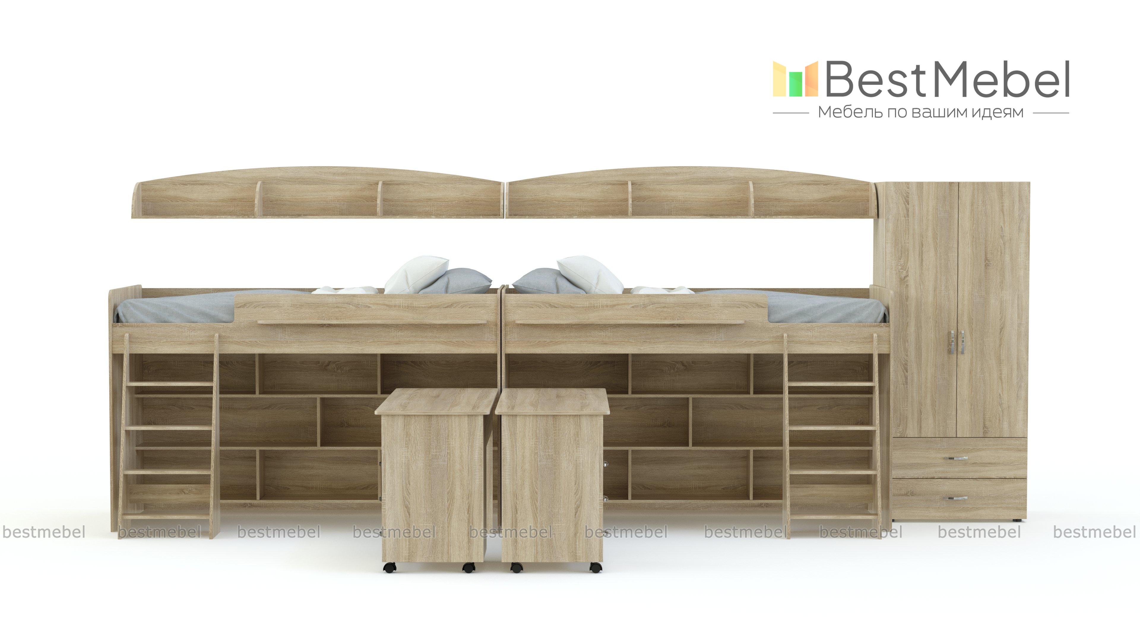 Двухъярусная кровать Миф 26.4 BMS позволит рационально организовать пространство детской для двоих школьников. Вместительный комплект включает в себя просторные спальные места с бортиками, полочками и устойчивыми лестницами. Ниша оборудована стеллажами с открытыми полками для книг и игрушек и выкатным письменным столом с боковой тумбой. Комплект сэкономит место, при этом обеспечив каждого ребенка индивидуальным уголком для учебы и игр. Купить двухъярусную кровать Миф 26.4 BMS недорого вы сможете у нас в интернет-магазине.