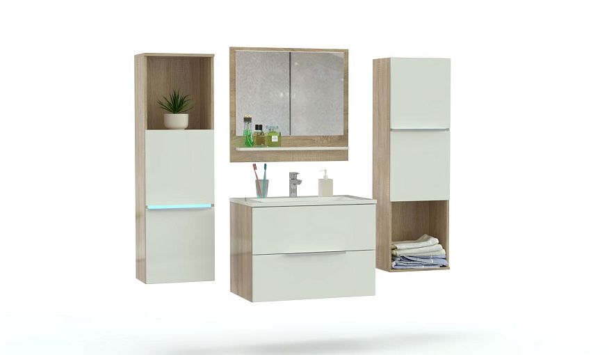 Комплект для ванной Сити 3 BMS, выполненный в белом и древесном оттенках, станет выбором тех, кто ценит яркие современные дизайны. Подвесная композиция объединила широкую тумбу под раковину, два комбинированных с нишами пенала и панно с зеркалом и открытой полочкой для мелочей. Практичная конструкция модулей позволит компактно разместить все необходимые уходовые средства и аксессуары. Купить комплект для ванной Сити 3 BMS с возможностью изготовления по индивидуальным размерам приглашаем в наш интернет-магазин.