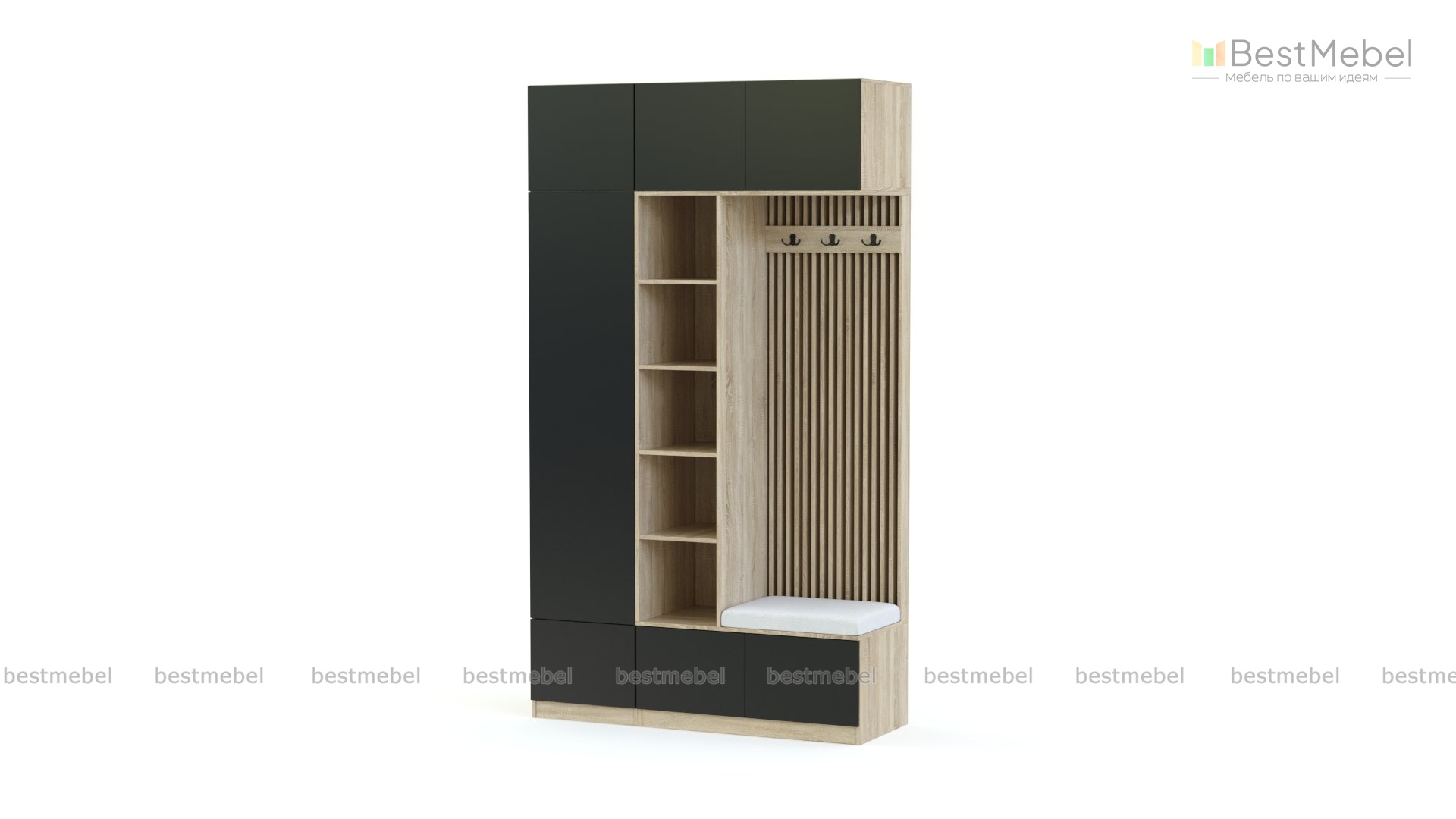 Прихожая Дублин 28 BMS воплощает в себе простоту и функциональность, присущие минимализму. В этой небольшой прихожей предусмотрены крючки для одежды и закрытое отделение со штангой, стеллаж под мелкие вещи, обувные и антресольные секции, а также мягкое сиденье. Декоративную роль играют вертикально расположенные панели открытой вешалки. Зеркальное отражение, выпил под плинтус 7*3, монтаж скрытый.