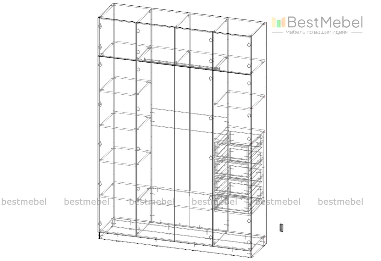 Шкаф Виллета 8 дополнен выдвижными ящиками, без ручек, открывается от нажатия, оснащен штангой овал в отделе платье и вместительными полками в бельевом отделении.