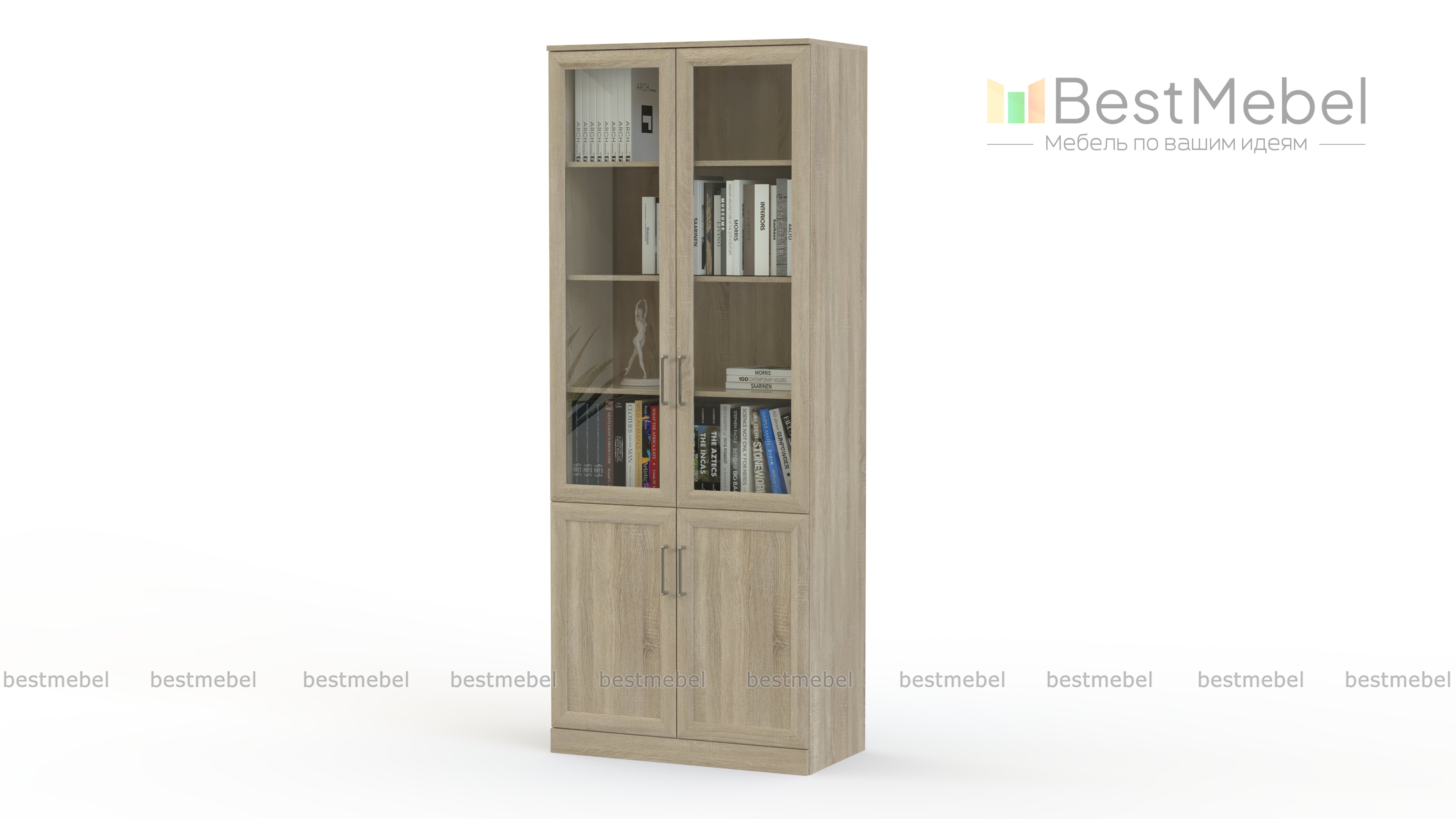 Уникальный и интересный шкаф книжный 2 №3 станет отличным приобретением для Вашего офиса. Модель получила красивых верхний шкафчик, который включает в себя восемь небольших стеллажей. Вы можете хранить здесь книги любых размеров, журналы и даже награды. Стеклянная панель придает изыска шкафу 2 №3. Два нижних отделения – шкафчика среднего размера – замечательное место для больших книг и крупноформатных журналов.
