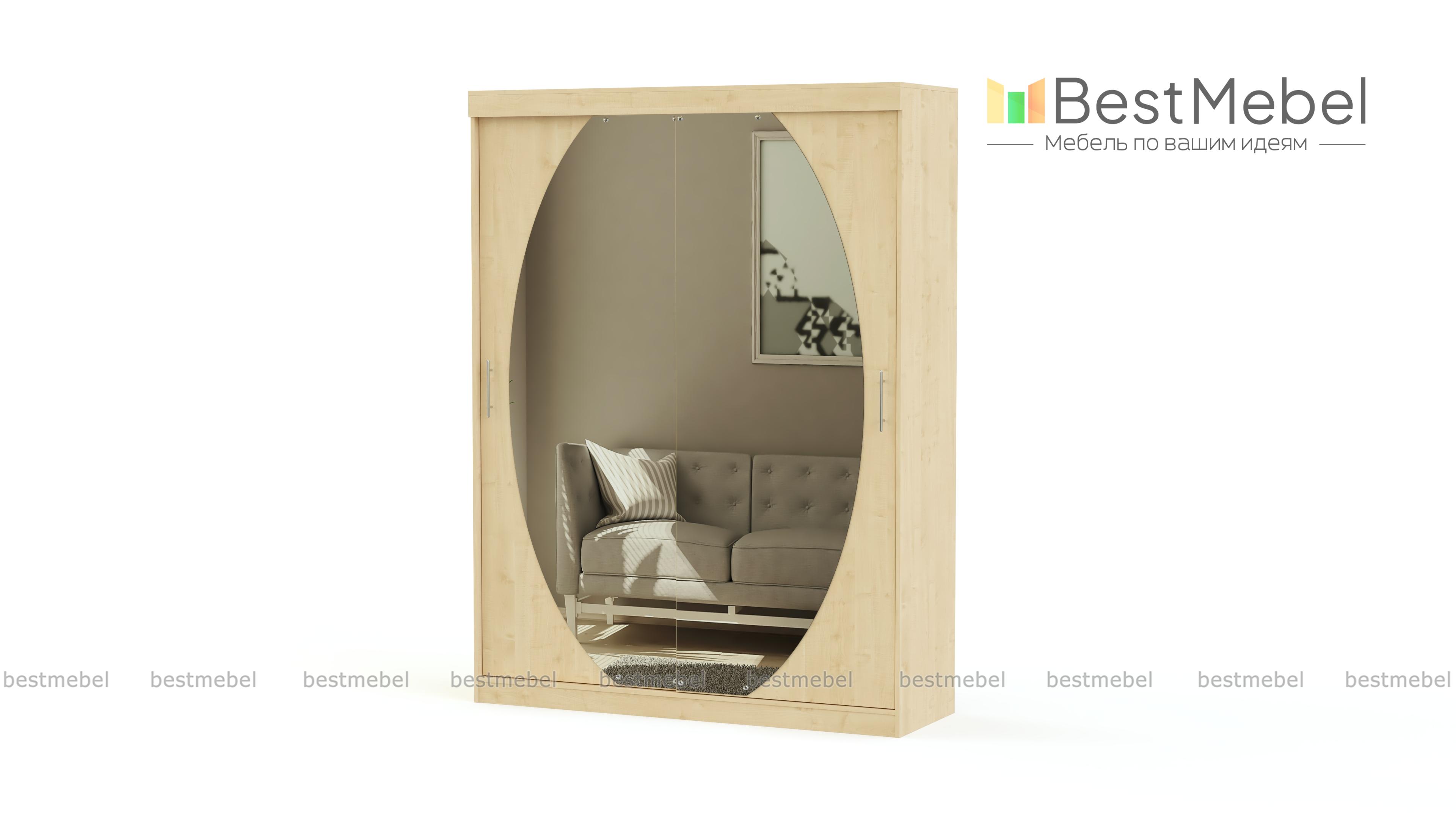 Элегантный шкаф-купе с зеркалом необычной формы. Последнее поможет зрительно увеличить площадь комнаты. Внутри шкаф имеет просторное отделение для вещей на вешалках и несколько объемных полок. Забудьте о смятых и скомканных вещах, которые едва влезают по ширине. На полках поместится одежда сразу в два ряда и еще останется место для того, чтобы ее аккуратно достать. Шкаф оснащен качественными алюминиевыми направляющими. Они обеспечат плавное и бесшумное открывание дверей. На нашем сайте можно выбрать цветовое оформление изделия, чтобы оно гармонично влилось в интерьер Вашего дома.
