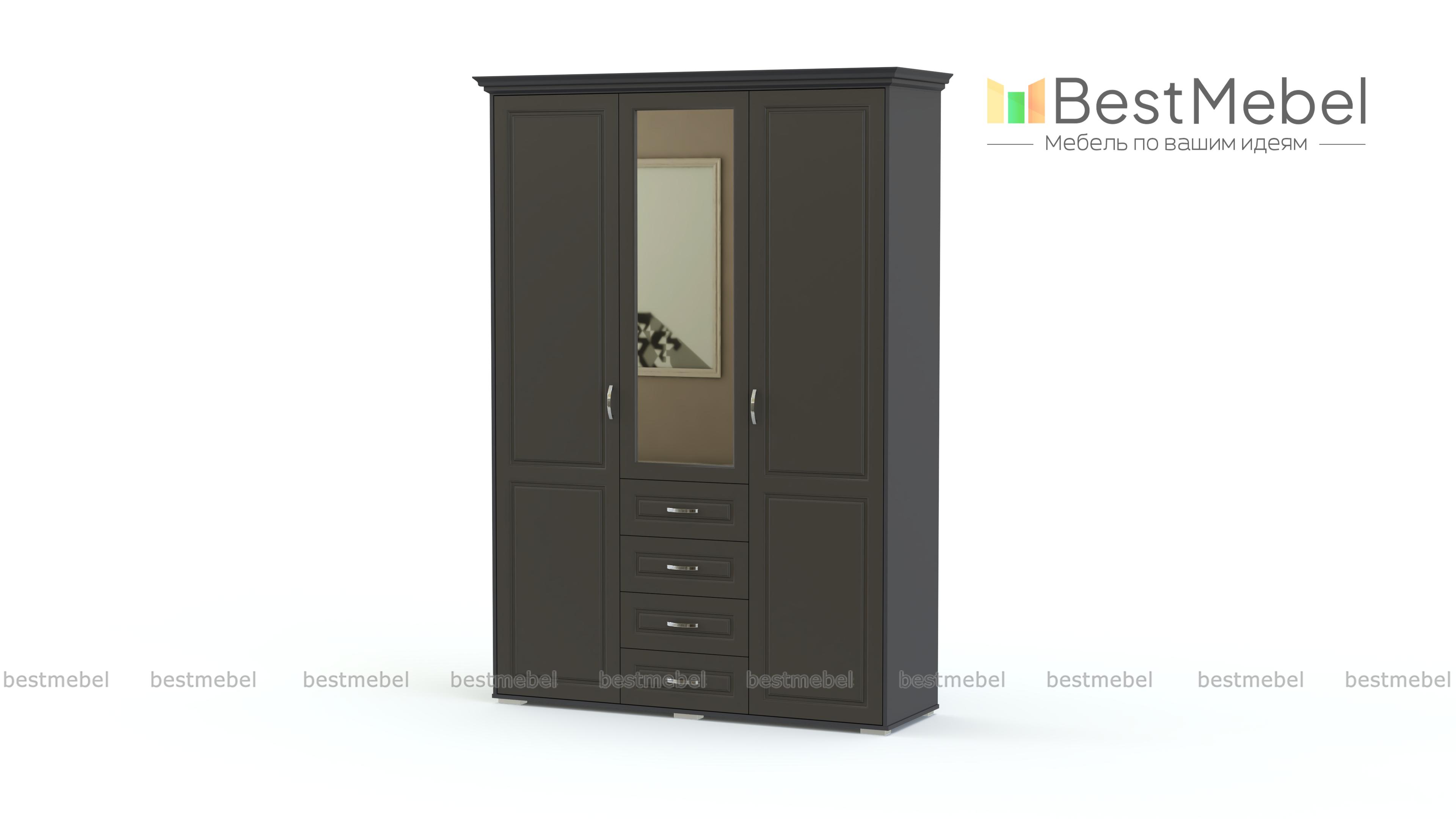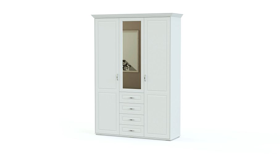 Распашной шкаф Мирма 4 BMS с классической фрезеровкой на карнизе и фасадах выполнен из материалов высокого качества в трендовом белом оттенке. Удобная система хранения трехдверного шкафа включает в себя распашные отделения с полками и штангой и четыре выдвижных ящика, оснащенных ручками-скобами. Зеркало на фасаде делает комфортным уход за собой и визуально облегчает конструкцию. Купить распашной шкаф Мирма 4 BMS для меблировки уютной современной спальни вы сможете в нашем интернет-магазине.