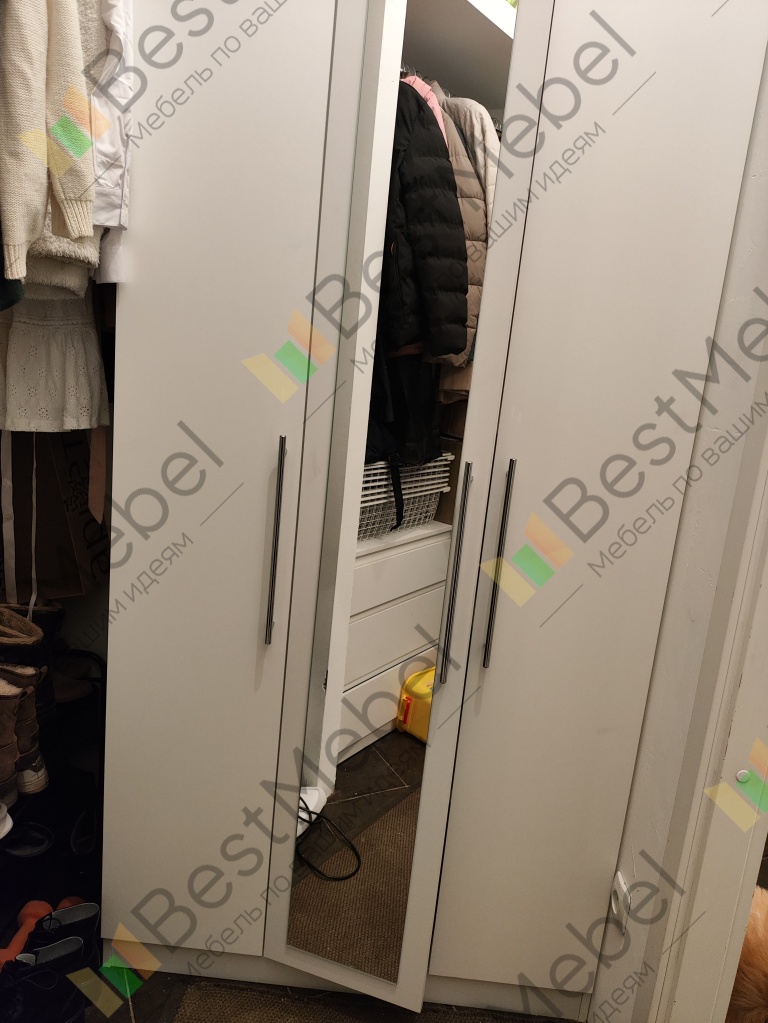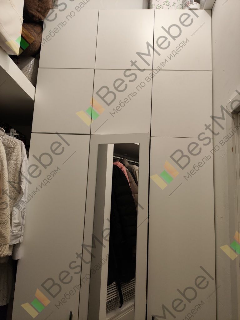 Шкаф порадовал, смотрится солидно. Есть возможность по своему усмотрению изменить конфигурацию: добавили зеркало и дополнительные полки, изменили ручки, изменили размеры. Думали будут проблемы из-за сборки в стеснённых условиях, но мастер за 3 часа все собрал на отлично. Заказ 00000133736