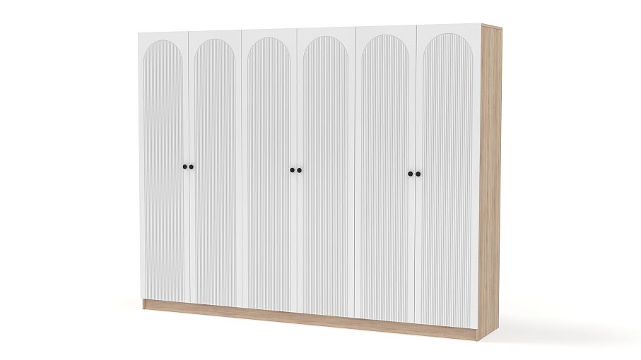 Шкаф распашной Рене 35 BMS — это отличная вместительность трех платяных отделений и современная эстетика. Фасад шестидверной модели с арочным декором и фрезеровкой красиво сочетается с корпусом в древесных тонах. Качественные материалы — ламинированная плита и МДФ, и надежная фурнитура делают пользование комфортным и долговечным. Купить шкаф распашной Рене 35 BMS вы сможете на сайте нашего интернет-магазина с изготовлением по индивидуальным размерам.