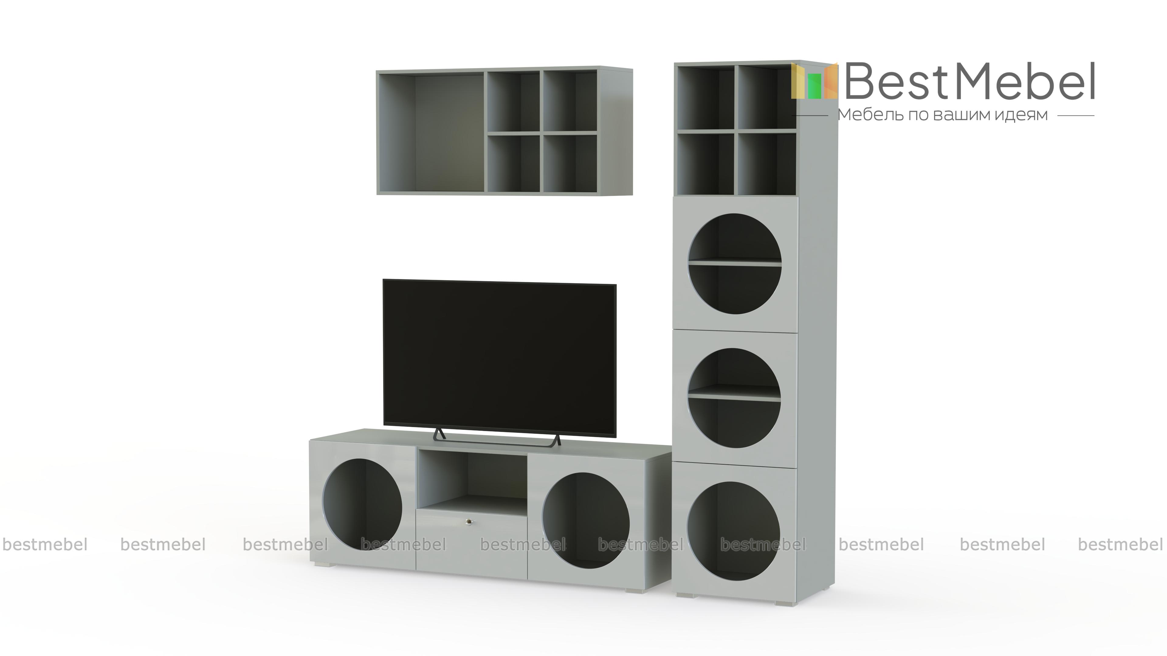 Стенка для гостиной Авелин 2 BMS сочетает в себе эстетику и практичность. Современная модульная композиция, выполненная в базовых оттенках, включает в себя широкую телевизионную тумбу, стеллаж и навесную полку. Интересную геометрию создают открытые круглые полки, в которых можно расположить книги и журналы, посуду и интерьерные аксессуары. Купить стенку для гостиной Авелин 2 BMS приглашаем в наш интернет-магазин с изготовлением по индивидуальным размерам.