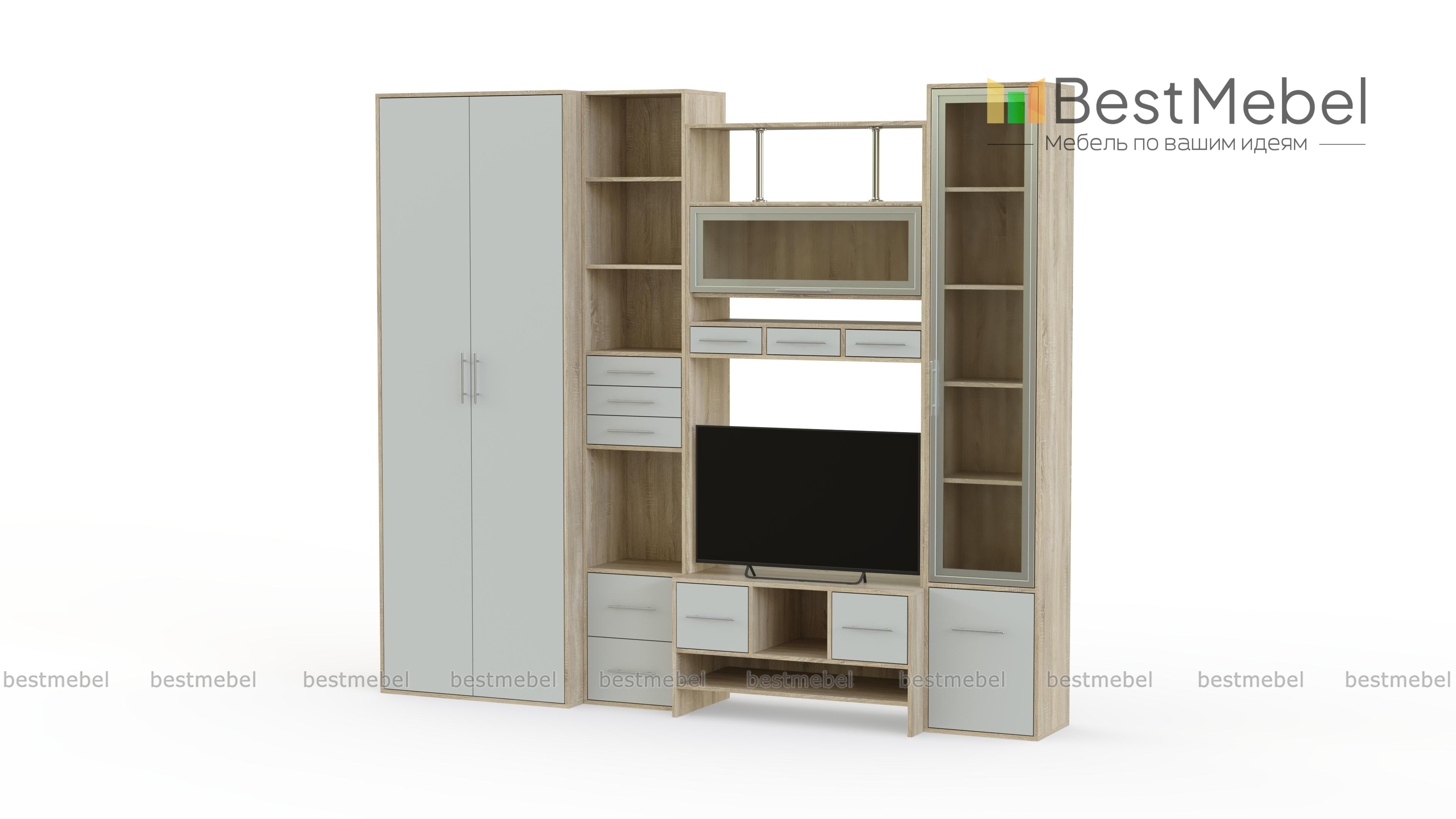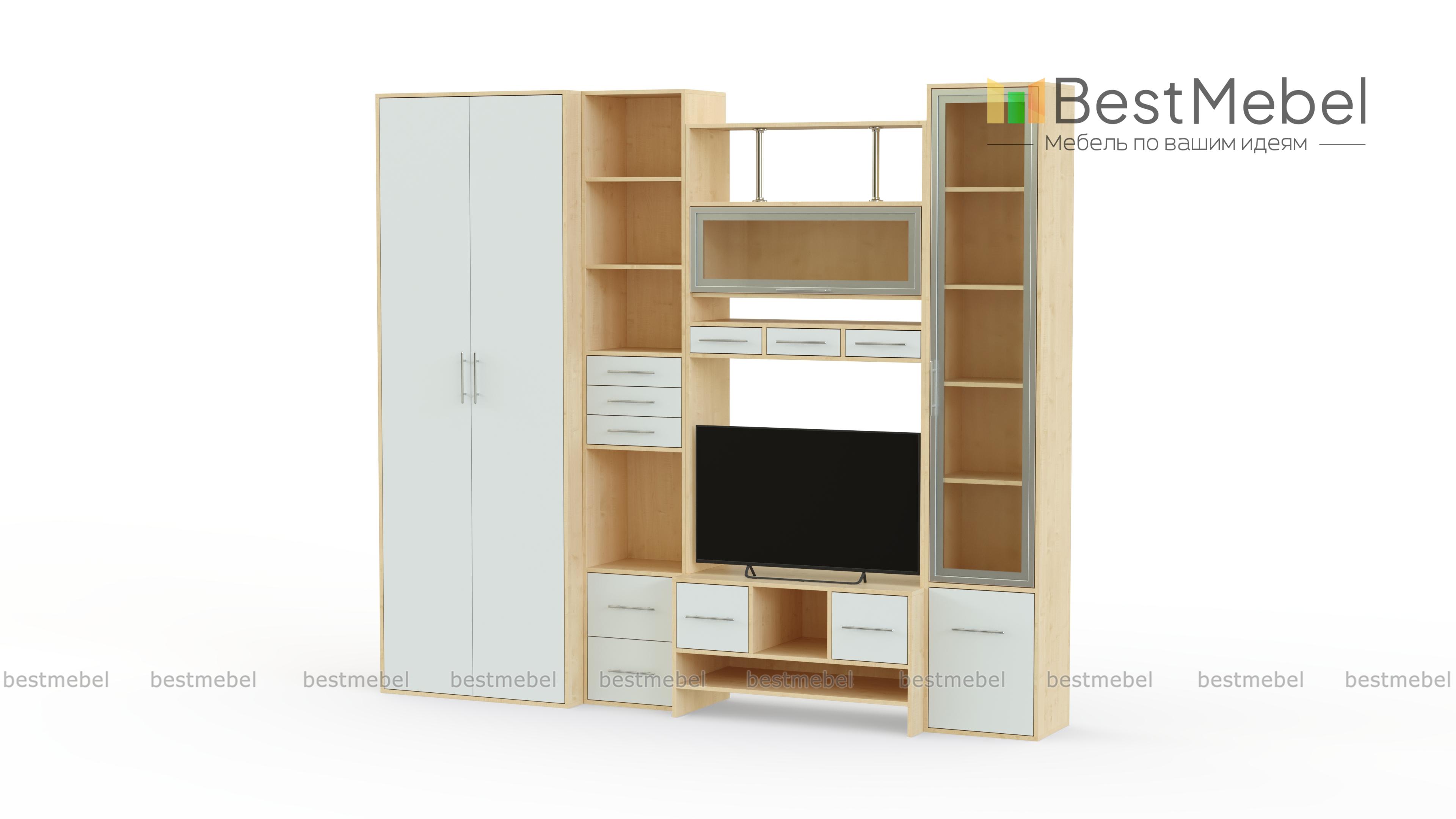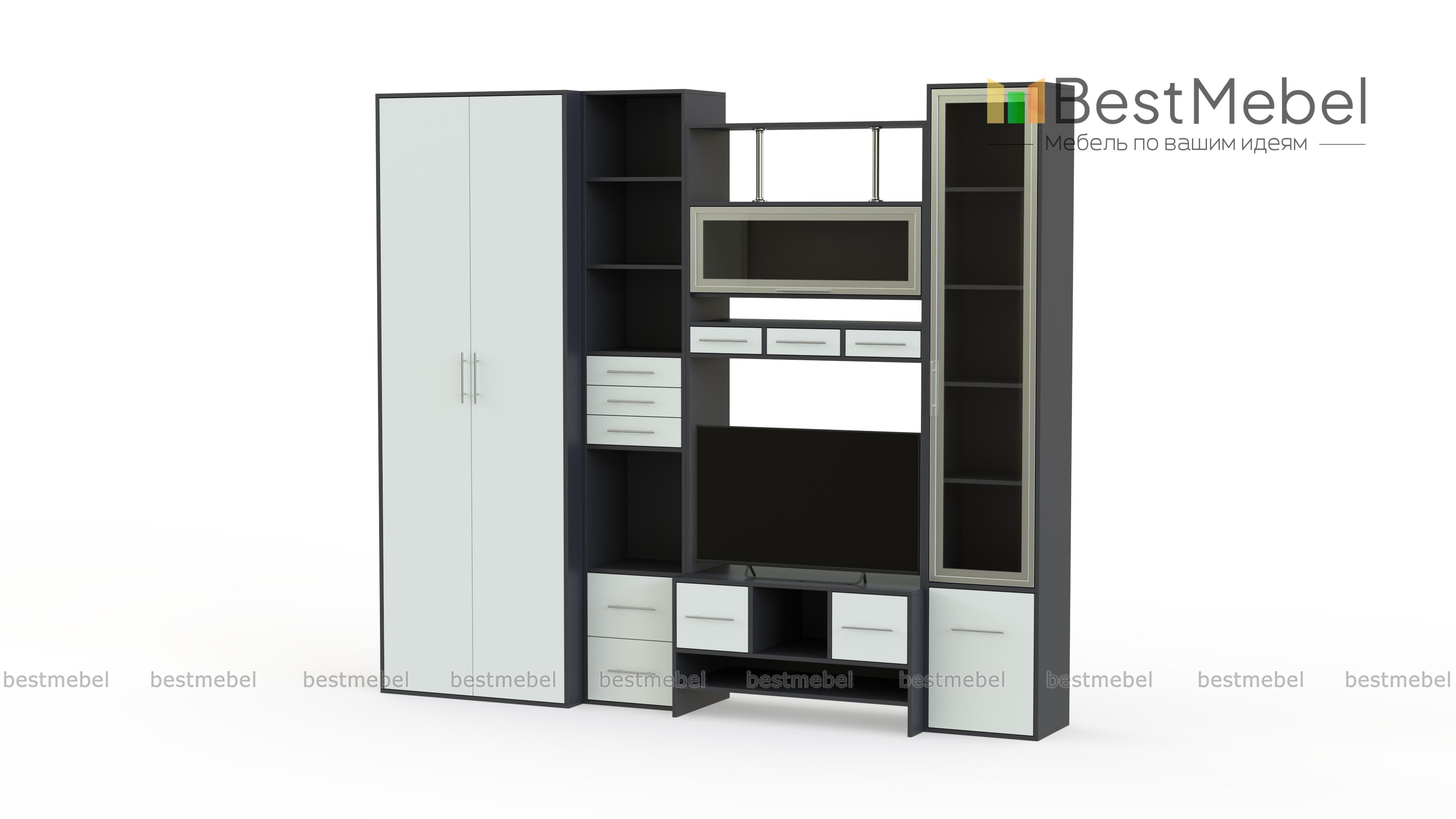 Стенка Фиджи 1 BMS – это компактная удобная в установке, невероятно красивая мебель для современной квартиры. Не занимая много пространства, она обладает всеми функциями традиционной полноценной стенки. В комплект входят высокий двустворчатый плательный шкаф, два пенала, один из которых имеет распашную застекленную дверцу и закрытый отсек внизу, другой оборудован несколькими выдвижными ящичками и открытыми нишами. Над столешницей, предназначенной для телевизора, установлена полка, закрывающаяся откидывающейся вверх дверкой с остеклением. Стильно смотрятся изящные никелированные трубки, поддерживающие верхнюю полку. Наличие различных ящиков и полочек станут прекрасным местом хранения бытовых мелочей и отличной подставкой для элементов декора. Купить качественное и недорогое изделие можно у нас в режиме онлайн.