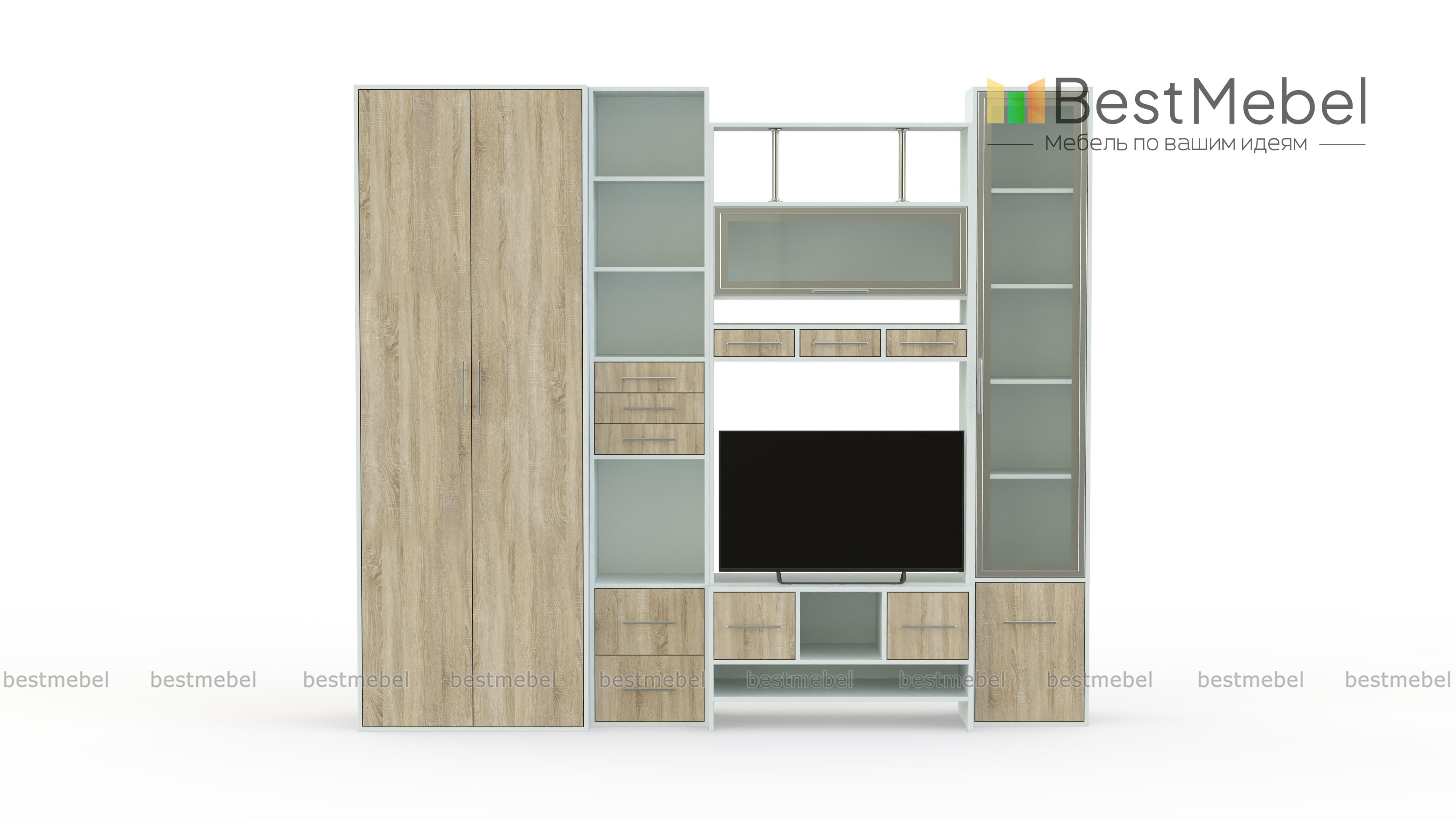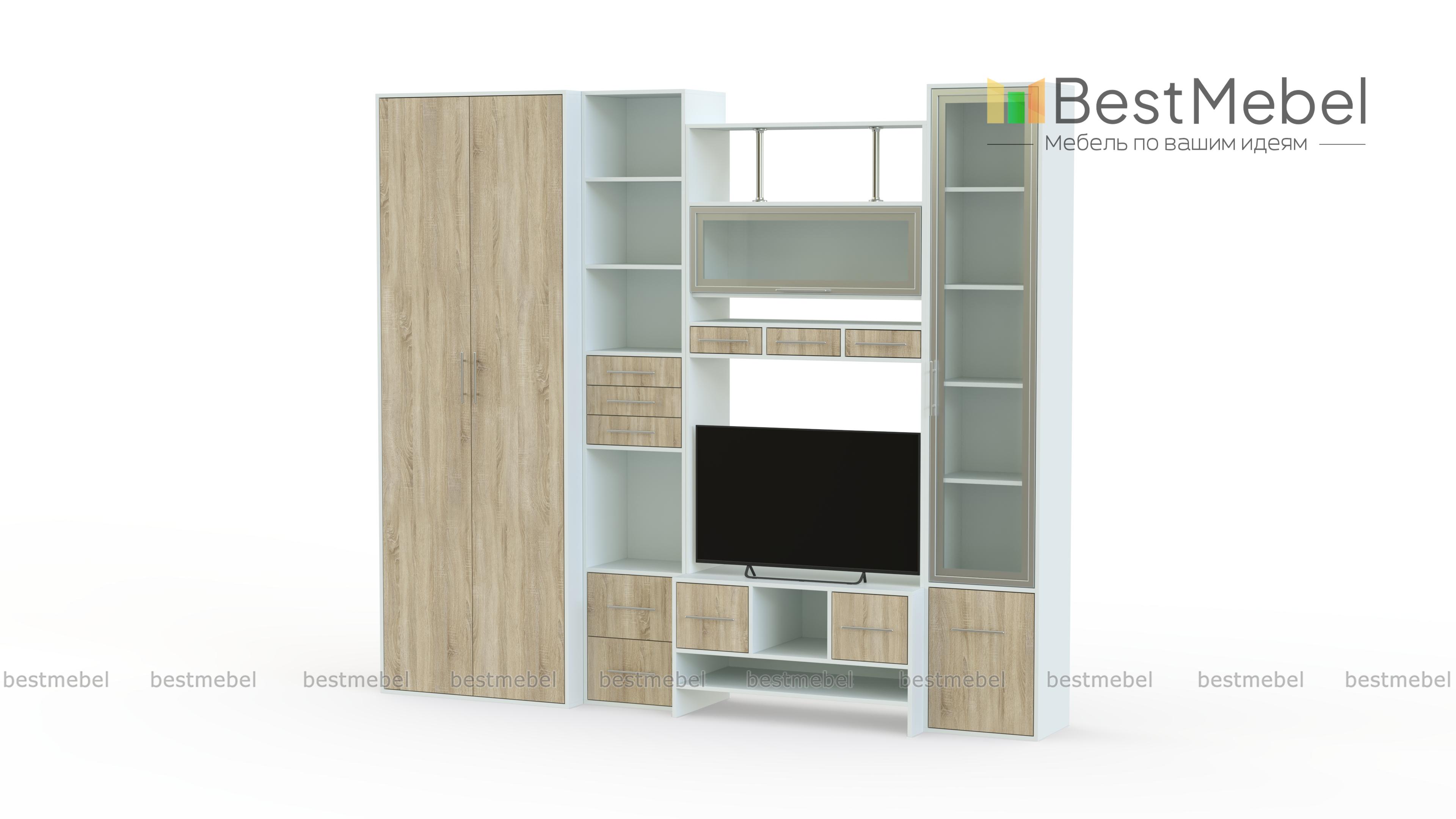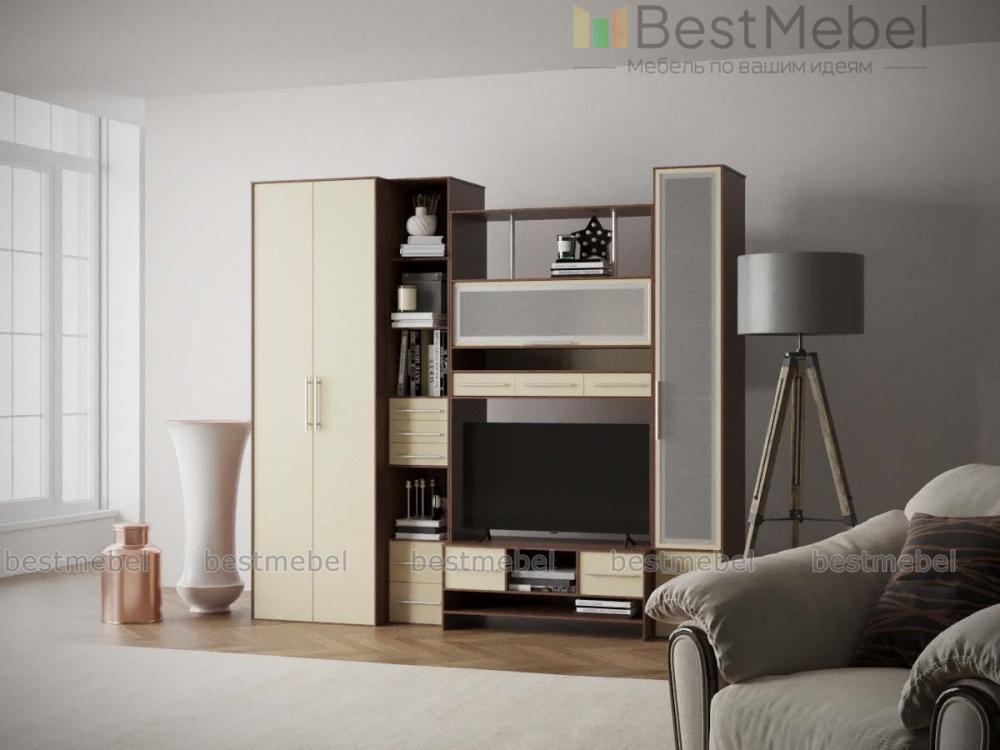 Стенка Фиджи 1 BMS – это компактная удобная в установке, невероятно красивая мебель для современной квартиры. Не занимая много пространства, она обладает всеми функциями традиционной полноценной стенки. В комплект входят высокий двустворчатый плательный шкаф, два пенала, один из которых имеет распашную застекленную дверцу и закрытый отсек внизу, другой оборудован несколькими выдвижными ящичками и открытыми нишами. Над столешницей, предназначенной для телевизора, установлена полка, закрывающаяся откидывающейся вверх дверкой с остеклением. Стильно смотрятся изящные никелированные трубки, поддерживающие верхнюю полку. Наличие различных ящиков и полочек станут прекрасным местом хранения бытовых мелочей и отличной подставкой для элементов декора. Купить качественное и недорогое изделие можно у нас в режиме онлайн.