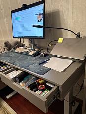 Отличный стол, копия икеевского стола Алекс. Только есть возможность изменить размеры, отделку, цвет, направляющие. Заказала одновременно со стандартным стеллажом. Собрали сами без проблем. Прикрутили к подстолью с подъемным механизмом. Получился очень комфортный мини-офис на дому.
