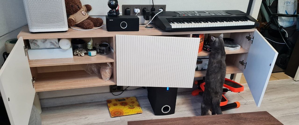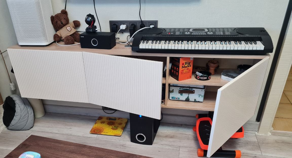 Красивая тумба для гостиной, собрали легко, исключение составили дверцы: при ширине тумбы 180 см, каждая дверца оказалась слишком тяжелой для мебельных петель, происходит перекос (опускание) свободного края дверцы. При ширине тумбы более стандартного рекомендуем увеличить количество секций до 4