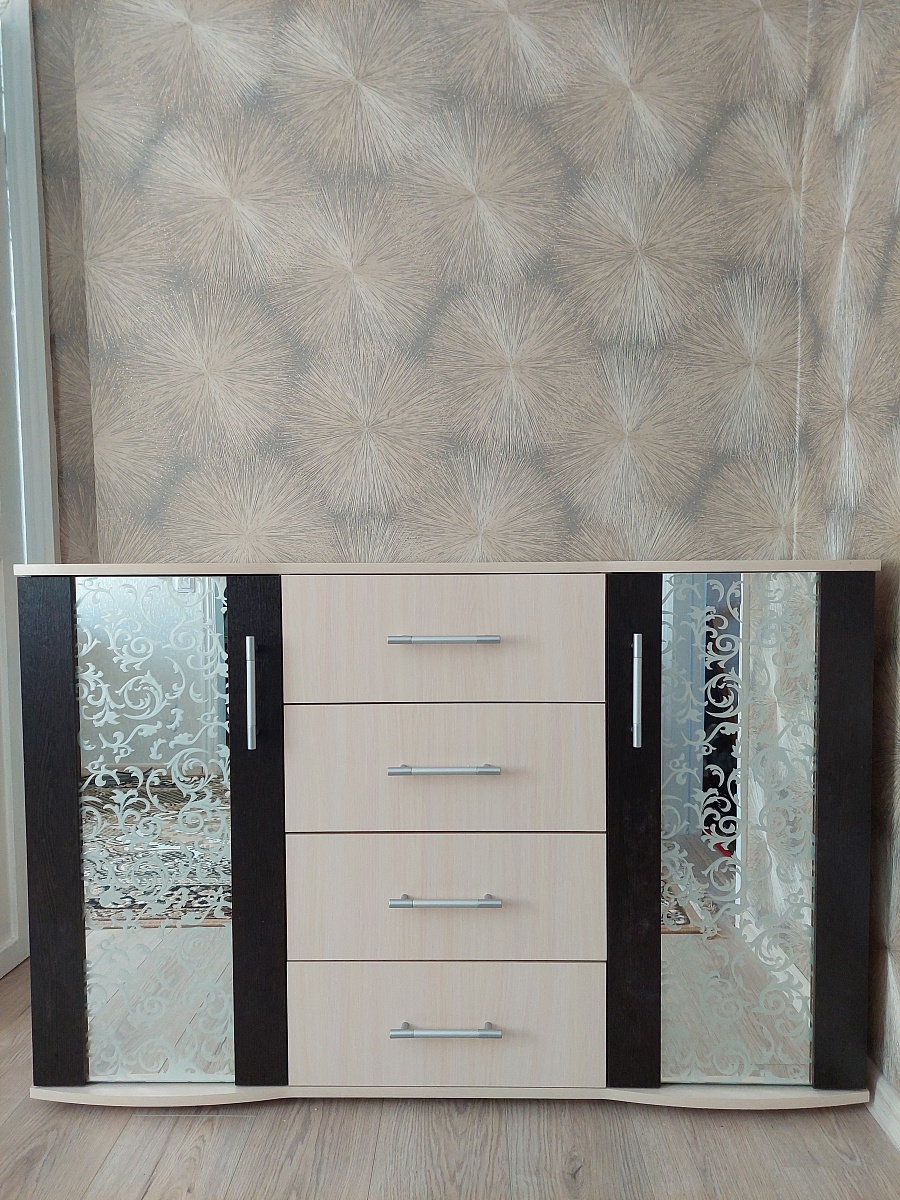 Заказывал тумбу строго под определенный размер и дизайн. К уже имеющимся комоду и витрине. Вышло очень похоже. Удачное сочетание дверей с полками по краям и трёх ящиков в центре.