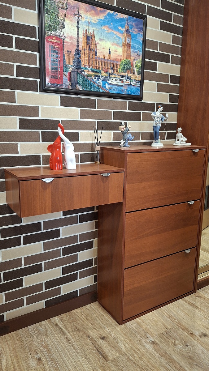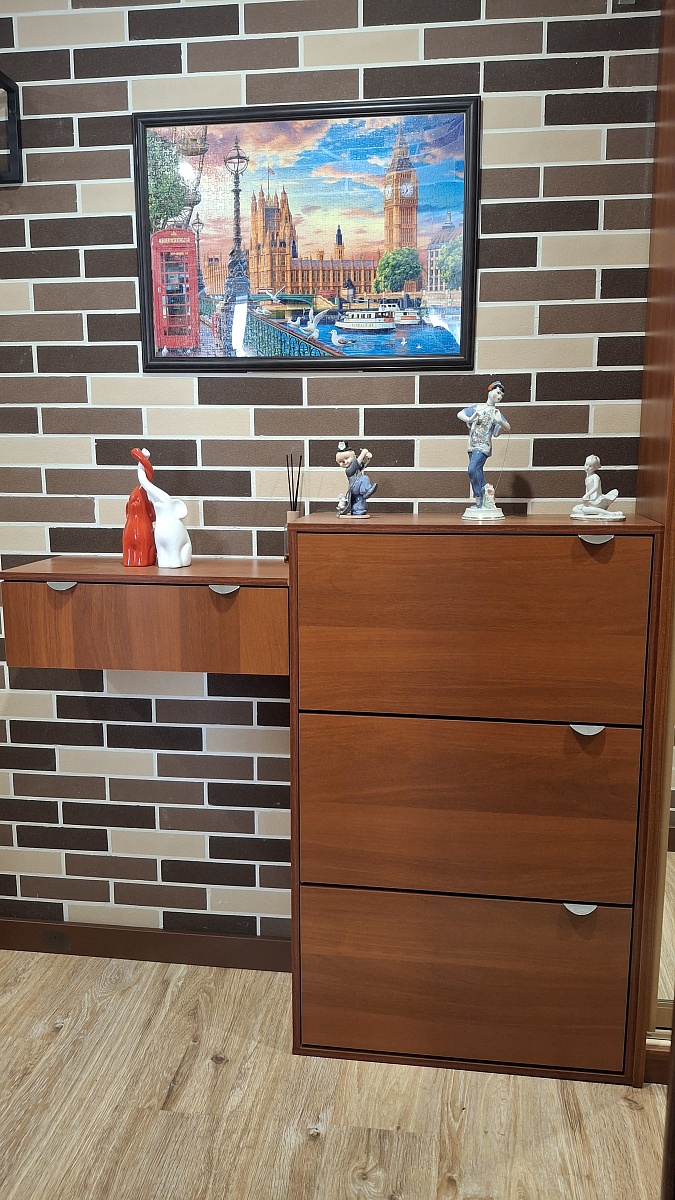 Купили буфет. Изменила стандартные цвета и петли. Стал сильно дороже. Добавила светильник (на магните из ЛеманаПро). Вписался буфет идеально. Устойчивый, не заваливается, крепко держится, не шаткий. Направляющие в ящики лучше простые ставить, а если с доводчиками хотите, то берите самые лучшие. Доводчики среднего качества не работают. Буду менять.Собирали пол-дня о онлайн схеме - очень удобно.Видимые на боковинах болты предлагают заклеить специальными наклейками, но я их лучше покрашу в цвет корпуса.В остальном, претензий нет!По дизайну вписался идеально.Доставили быстро в полной комплектации.