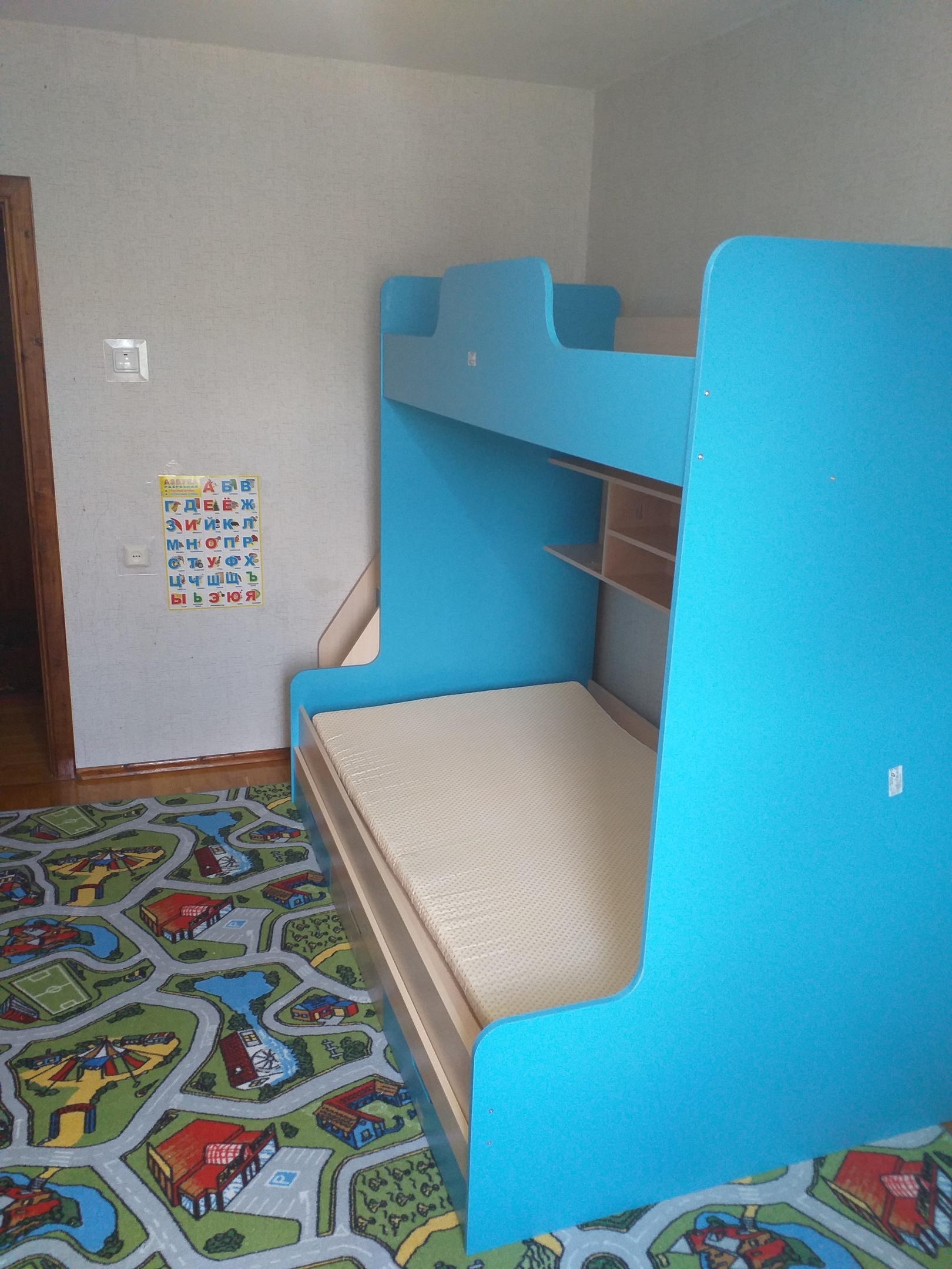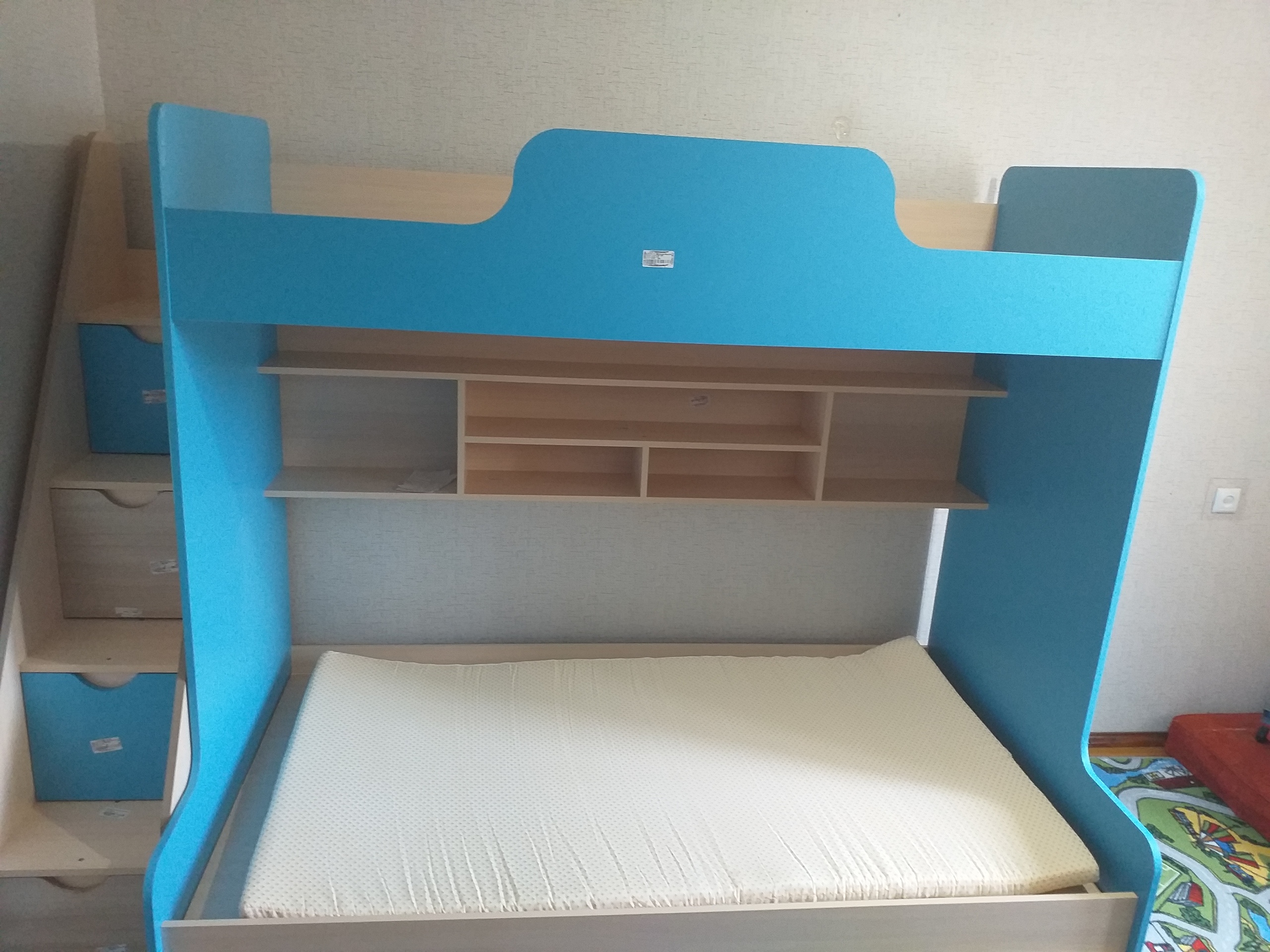 Кровать классная. Трехместная - две полки и одно выдвижное место. Держат вес огромного мужика, места много, сам лежал с удовольствием, хоть себе бери такую. Боялись, что ребенок будет биться головой, но по высоте нижнее месте хорошее. Взяли стандартную комплектацию (по размерам), В комплекте поролоновый матрас, его на выдвигаемое место хорошо оставить, другой туда не влезет.Доставка нормальная, парень-грузчик помог до подъезда дотащить.Моменты, которые могут стать минусами, если не учесть их.1) Элементы очень тяжелые!! В одиночку не поднять, я поднял один пакет из 7 на 3й этаж и чуть не сдох, руку вывернул, месяца 2 проходила кисть.2) Сборка: мне не собрать, я посмотрел, подумал, спросил родню, написал в сети, некоторые "гуру " в интернете плевались и били в грудь "не мужик, собрать не может, там 2 часа", в итоге я решил, что лучше вызову мастера от фирмы-партнера, парень 6 часов без перерыва собирал, зато сделал нормально. Короче собрать сложно её.3) Еще нюанс - острые углы, собственно как обычно у ДСП и ЛДСП.4) Кровать очень большая! 7 раз померьте комнату, а то мало ли что!У нас еще в подарок приехала полка навесная (можно было брать что-то за 1 рубль, акция), но полку я пока не вешал, собрал - стоит на полу. ))В плане сервиса магазин работает хорошо и внимательно, я очень доволен! Советую!