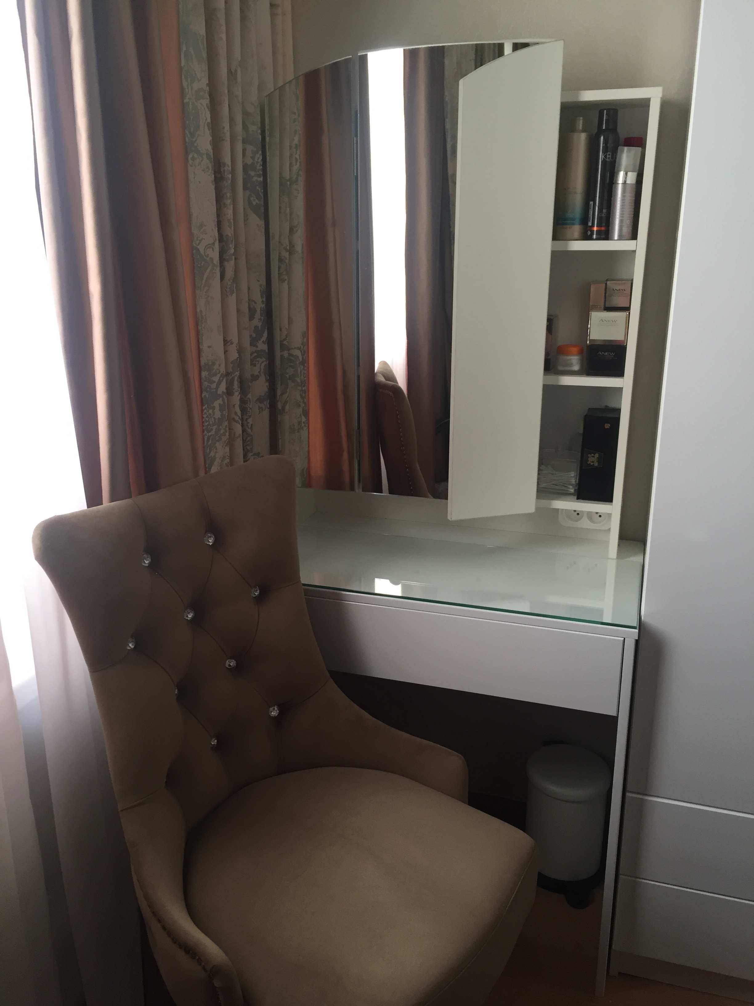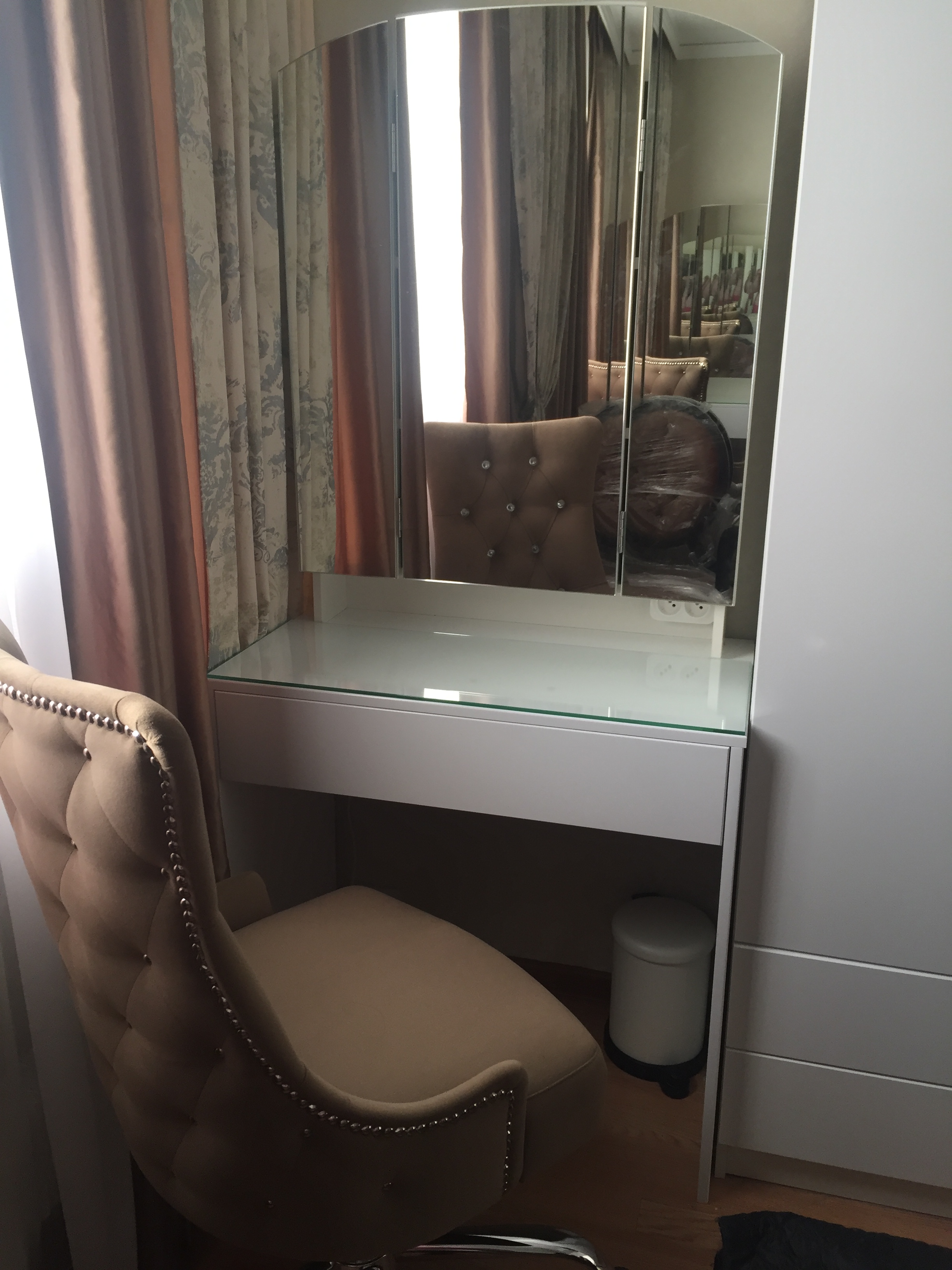 Туалетный столик Ривьера BMS - мой самый любимый модуль в спальне! Заказан в стандартных размерах, стекло на столик заказывалось отдельно. Очень функциональный, за ним можно работать на ноутбуке, шить на швейной машинке, писать.  Большое спасибо магазину Bestmebelshop. Столик идеально смотрится со стенкой, которую я покупала в этом же магазине. Много вместительных ящиков, два из них спрятаны за створками зеркала, нижний выдвижной шкаф без ручек, с системой push to open. Фасады белые, глянцевые. Действительно очень удобно поправлять прически. Не нарадуюсь!